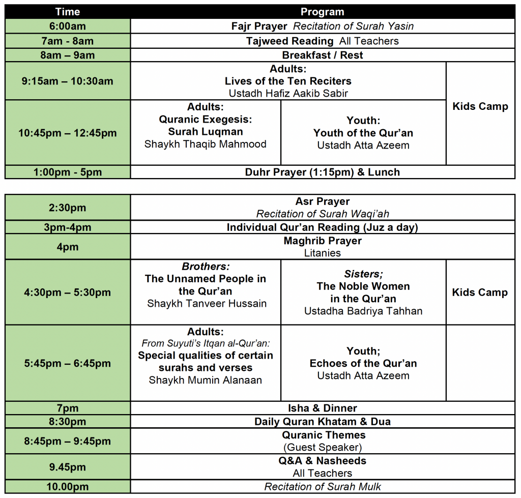 With nightly reminders on Qur’anic Themes and in the evening a Daily dua upon the completion of the Quran, this Halaqa guides participants through various facets of the Qur’an, exploring diverse themes and insights.